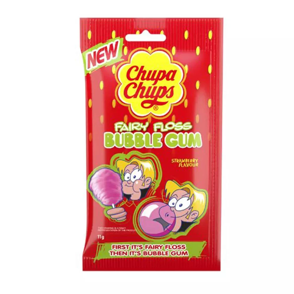 Strawberry Flavoured Chupa Chups Fairy Floss Bubble Gum. First its Fairy Floss, then its Bubble Gum. Lots of fun for the kids.