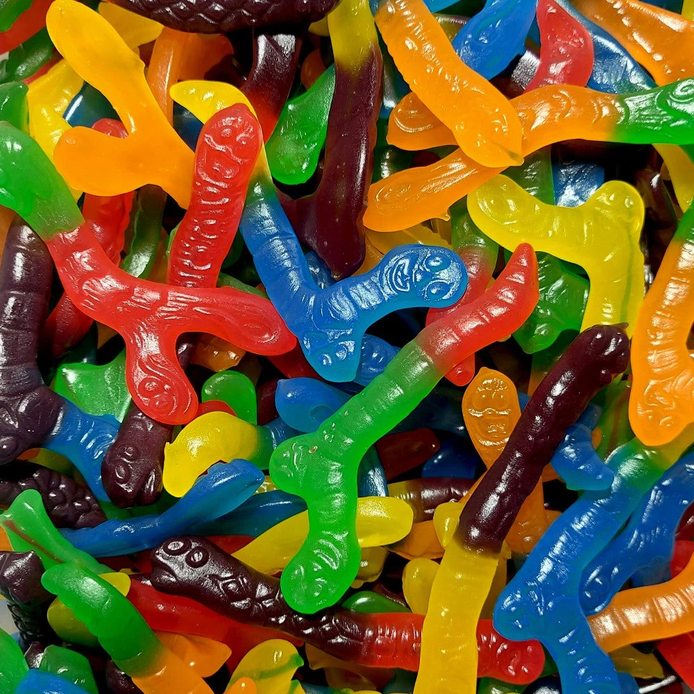Mutant gummy worm lollies. Shaped like little deformed earthworms with the possibility of multiple heads.