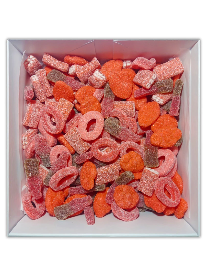 The perfect red coloured sweet lolly gift box, filled with sweet and sour treats.