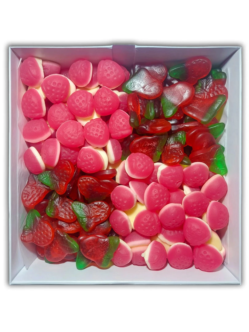 Engulf the flavor of pink Strawberry treats in this Strawberry gift box. Packed with a collection of soft gummy strawberry lollies. A perfect gift box for any woman or a great pink gift for sharing with your family and friends.