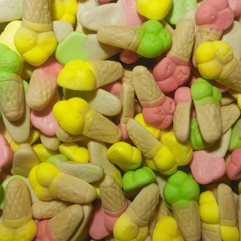 Ice Cream shaped gummy fondant lollies. Three coloured icecream top sweets, chewy in texture and extremely tastey.