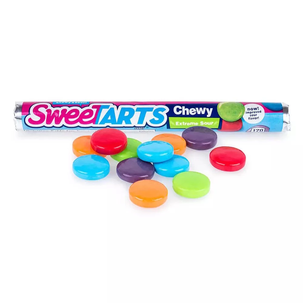 Sweetarts Chewy, extreme sour chewy Sweetarts. Now with and improved sour flavour. 5 Flavoured chewy sweetarts, Apple, Orange, Cherry, Blue Raspberry and Grape.