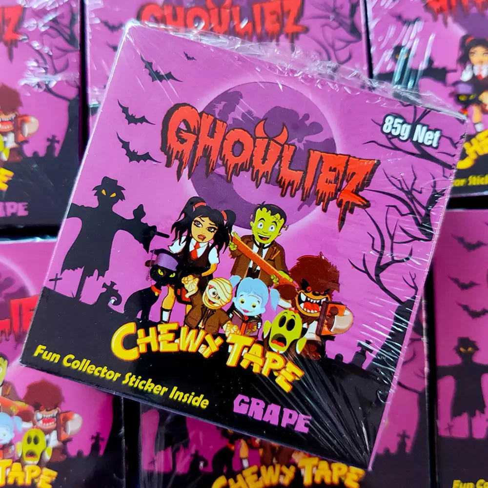 Ghouliez Grape Flavoured Chewy Tape. Box of Grape flavoured Chewy tape comes with 85g of fun flavoured chewing gum and a collectors sticker inside each box. These are similar to the Hubba Bubba Chewy Tape.