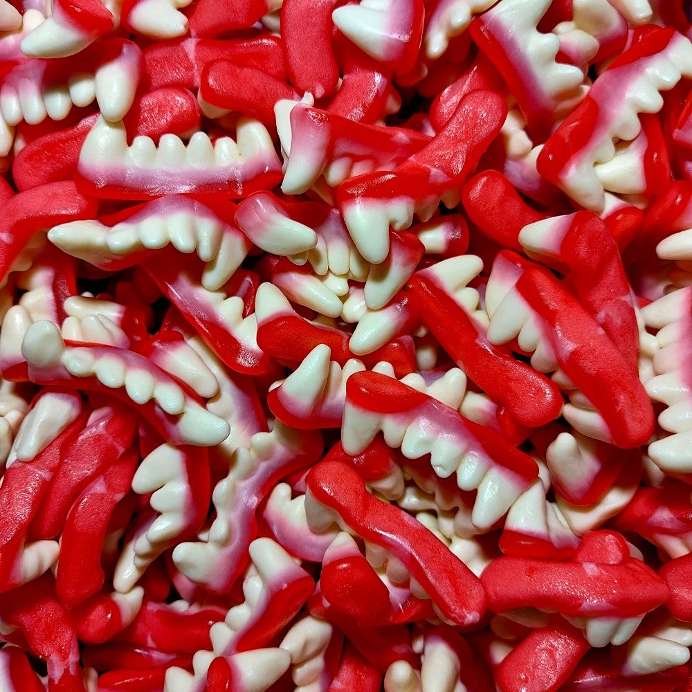 Vibrant Teeth Shaped Lollies with Red Gums, White Teeth and fangs just like a Dracula. Perfect Halloween lollies.