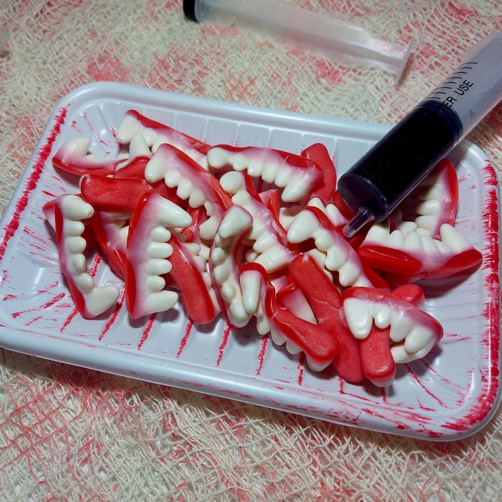 Get ready for Halloween with your very own Dracula Teeth Lollies. Gummy Halloween Lollies Shaped Like Dracula Teeth. (Accessories in the photo are not included)