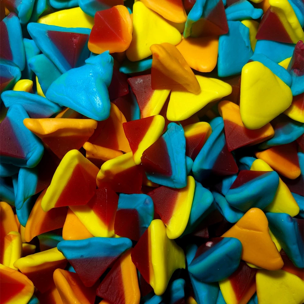 Three erupting flavours of volcano-shaped lollies mixed together. Colourful bottoms with Red Volcanic tops.