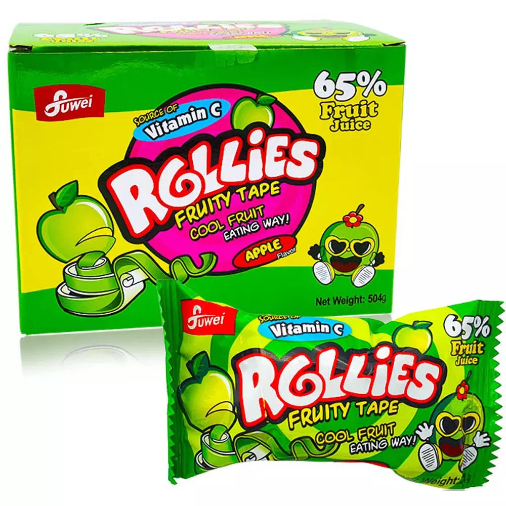 Rollies Fruity Tape. A Cool Fruit eating way made from 65% Fruit juice. Enjoy these rolls of delicious fruit flavoured tapes similar to the classic rollups.
