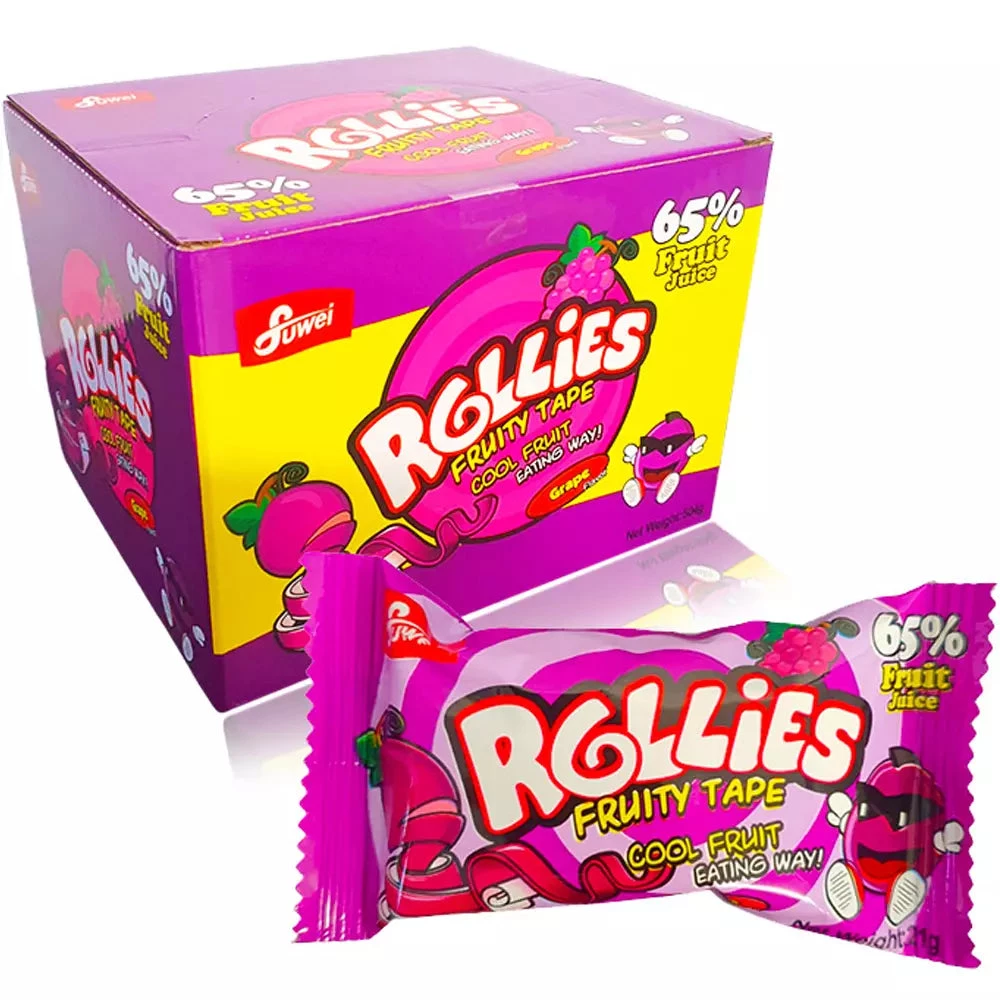 Rollies Fruity Tape. A Cool Fruit eating way made from 65% Fruit juice. Enjoy these rolls of delicious fruit flavoured tapes similar to the classic rollups.
