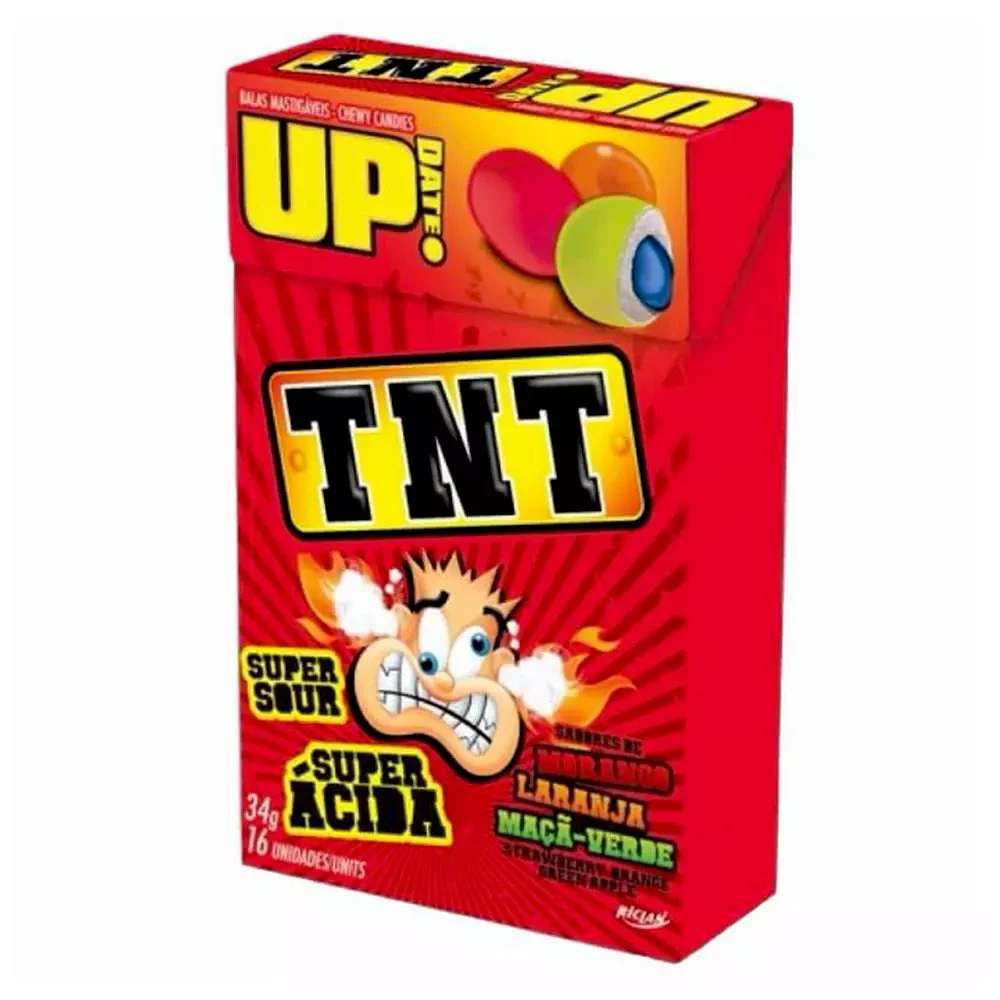 TNT Up Date Super Sour Strawberry, Orange and Green AppleChew Candies with sour filling.