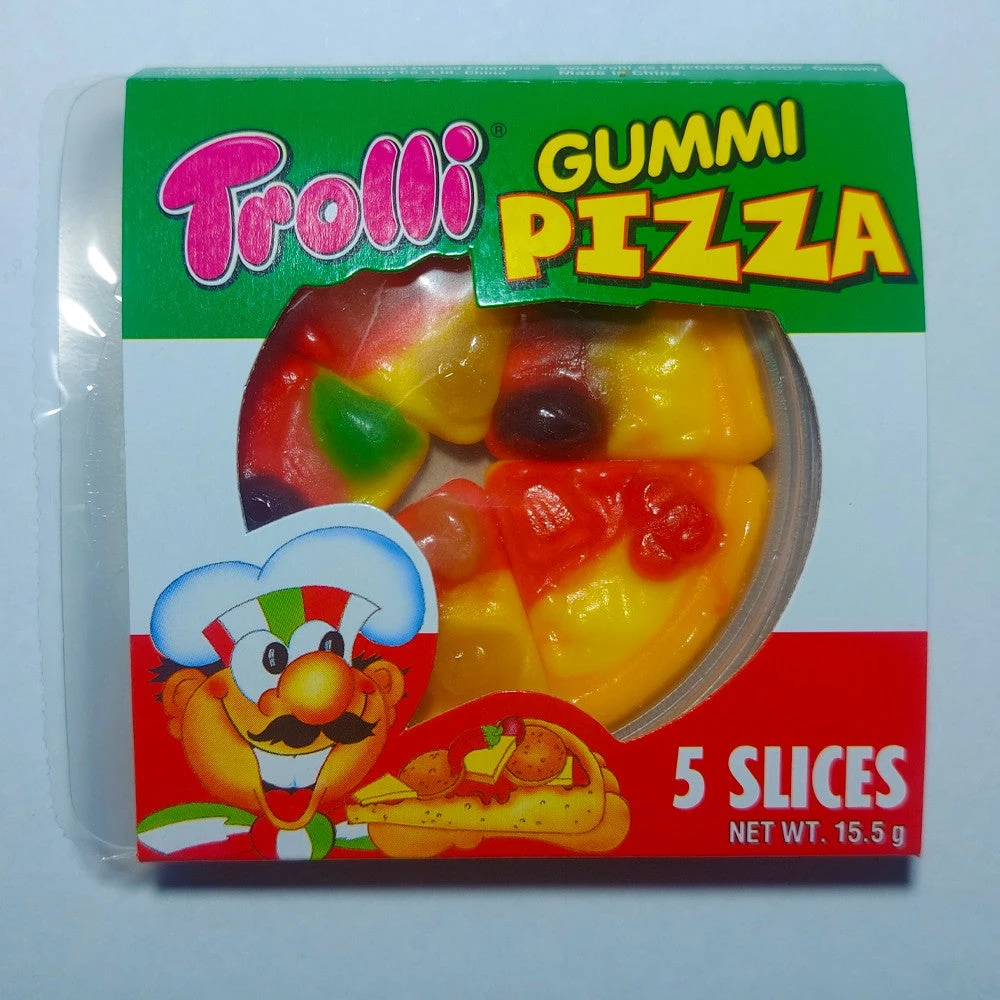 A five-piece mini gummy pizza. Treat yourself with a delicious chewy fun treat. Trolli Gummi Candy Pizza. Price is for one (1) mini pizza