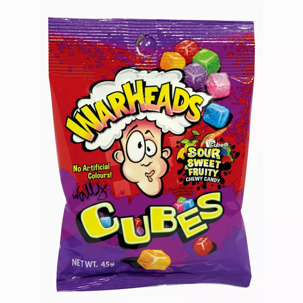 Warheads Cubes, Cubed Sour and Sweet Fruity Chewy Candy. No Artificial colours in these fruity flavours: Orange, Green Apple, Watermelon, Strawberry, Blue Raspberry and Black Cherry.
